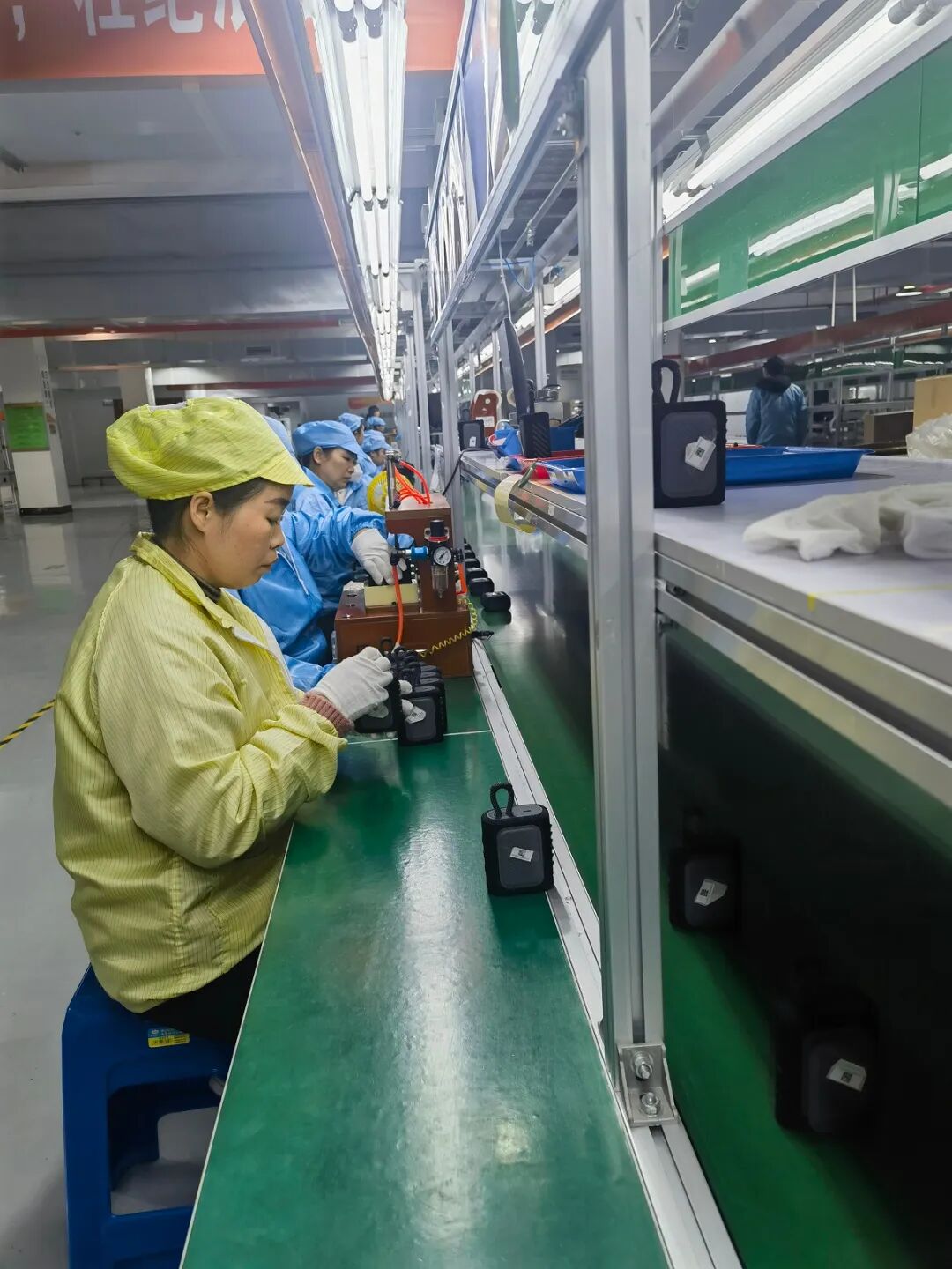 2023年12月20日,在三诺跨境电子产业示范园内,工人们在凭祥市三诺数字科技有限公司的生产车间里加紧生产智能音箱。