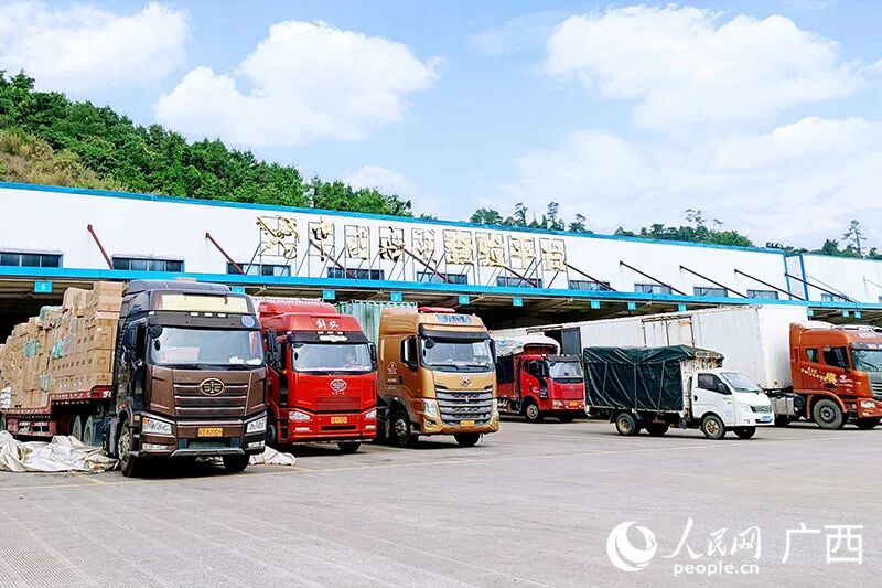 货车在友谊关口岸排队通关。人民网 何宁 摄