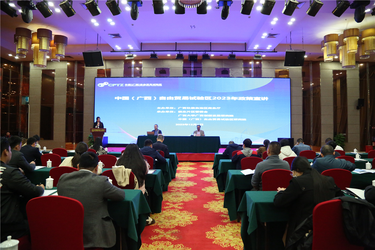 12月1日,中国(广西)自由贸易试验区2023年政策宣讲——外贸新业态新模式学习宣讲会在崇左片区举行。中山大学自贸区综合研究院院长、广西自贸试验区顾问委员会委员符正平从发展对外贸易新业态新模式、提升新型贸易发展水平等方面对相关政策进行深度解读。南宁、钦州港、崇左片区管委会及片区企业代表等约70人参会。