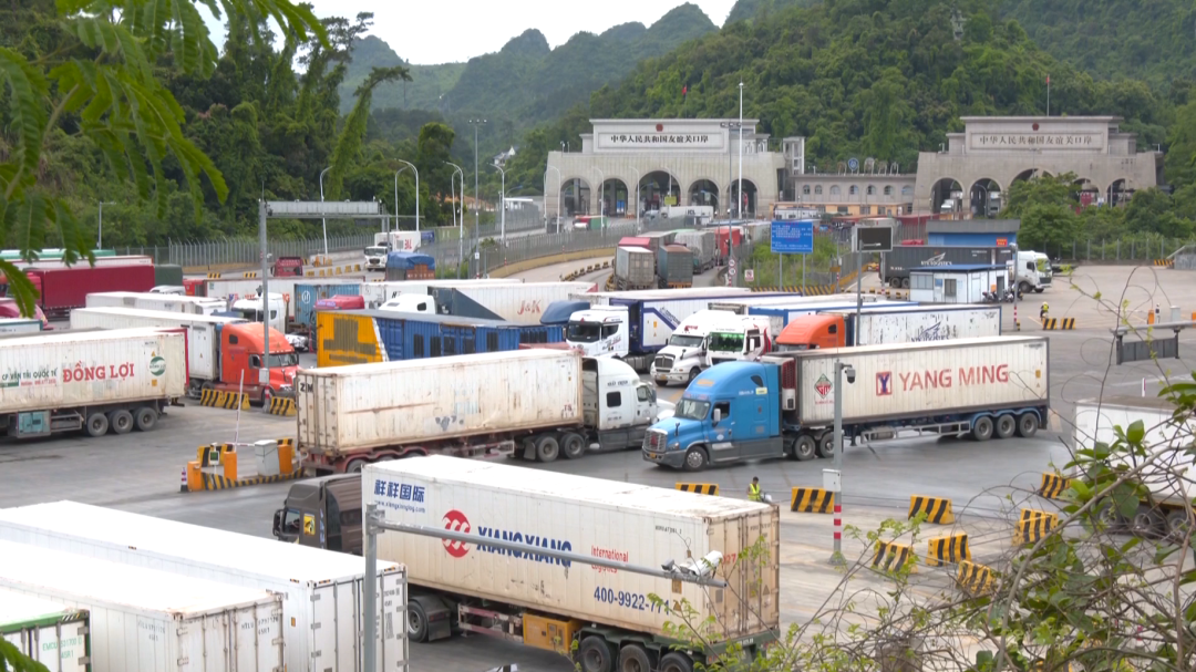 早上,司机邹达健和蔡炳南早早来到端航停车场,他们今天要将两台出口的牵引车头开往越南春疆货场。出发前,他们认真检查车辆情况。检查完毕后,他们便开始出发。来到友谊关口岸二道卡前,这里有许多重型卡车正排队有序通关。得益于“一票多车+一次性验放”的模式,邹达健和蔡炳南一路畅通无阻。