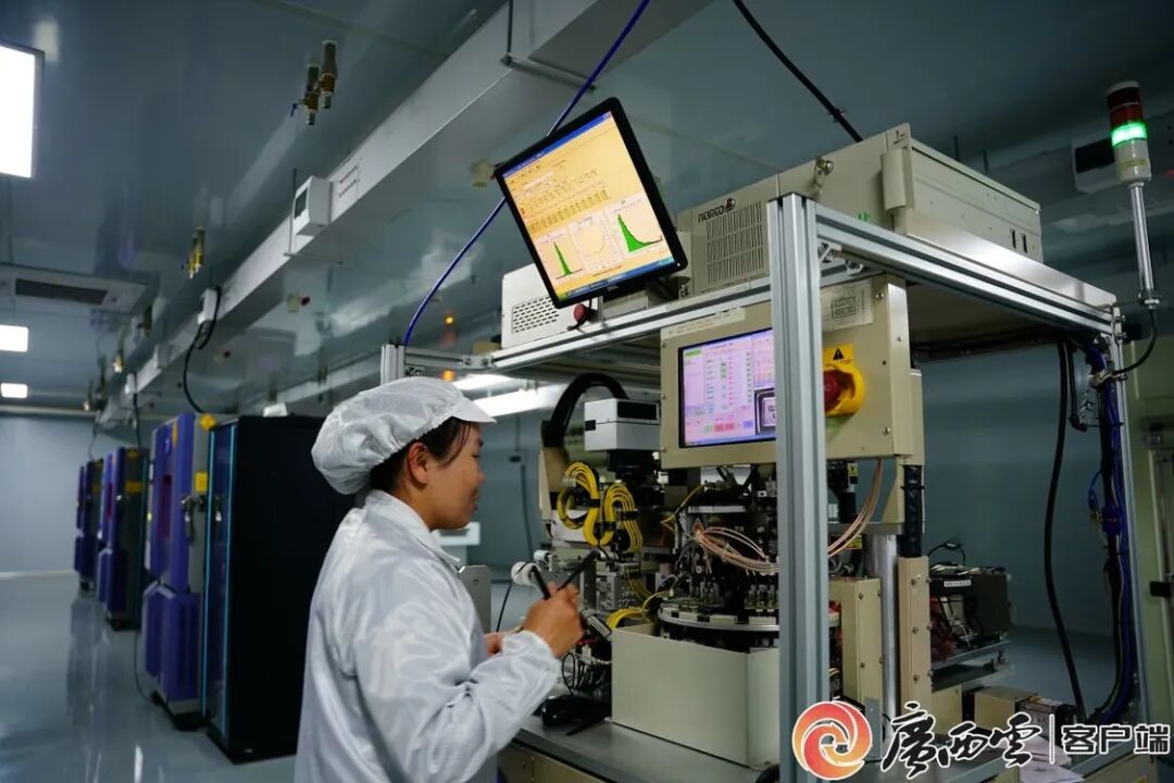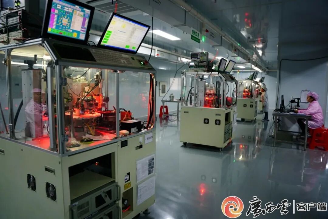 走进广西晶优电子科技有限公司产品展示区,芯片原子钟、晶体谐振器、晶体振荡器等系列产品琳琅满目,彰显了“中国智造”的沿边力量。步入14500平方米的标准化厂房,无尘车间里机器指示灯闪烁,防静电灯光柔和地洒在每一台精密设备上。采风团成员透过透明观察窗看到,身着白色防静电服、头戴防尘帽的技术工人,正操作各种设备,将一枚枚米粒大小的晶体元件输入其中。微小的晶振元件最终组装并应用于通信、导航等领域的高端产品,市场供不应求。作为粤桂协作“飞地”项目的标杆,这家投资1.5亿元的企业预计满产后年营业额将达3亿元,带动200人就业。
