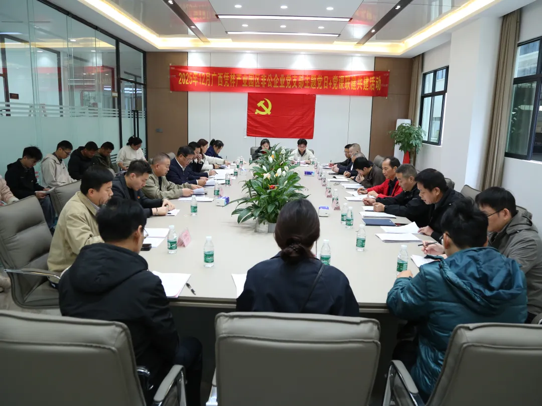 12月26日,广西凭祥产业园区非公有制企业党支部在新中林木业有限公司党支部活动室成功举办“党建引领聚合力 联建共建促发展”主题党日暨联合党课活动。此次活动是凭祥综保区、自贸试验区崇左片区、凭祥边境经济合作区“三区合一”后,首次由非公有制企业综合党委委员所在党支部牵头举办的主题党日联建活动,三大片区31家非公企业党支部党员、发展对象、入党积极分子参与,创新联建共建方式,破解园区单一企业党支部独立组织主题党日活动的难题。